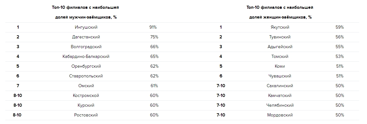 Доля мужчин-заёмщиков максимальна в Ингушском (91%), Дагестанском (75%) и Волгоградском (66%) филиалах, минимальный перевес отмечен в Новосибирском и Хабаровском филиалах (по 51%).