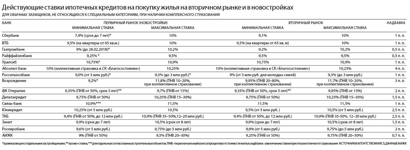 По данным аналитического центра «Русипотека», за 2017 г. средняя ставка предложения как на первичном, так и на вторичном рынке сократилась более чем на 2 п. п. и в декабре достигла 10,19 и 10,1% годовых соответственно. «Средневзвешенные ставки 20 крупнейших ипотечных банков (каждый из них раз в 2–3 месяца снижал ставки) достигли к началу 2018 г. 10,75% на рынке первичного и 10,88% на рынке вторичного жилья, снизившись за год на 2,35 и 2,64 п. п. соответственно, говорит директор департамента мониторинга банковских продуктов маркетингового агентства Marсs Наталья Абрамова.