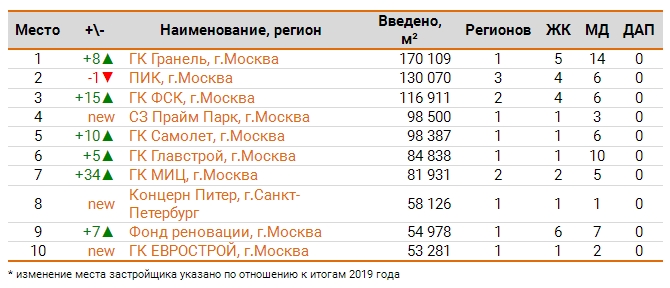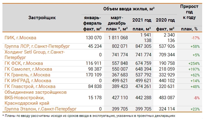 Если планы застройщиков по вводу жилья в 2021 году будут выполнены, то десятка лидеров по итогам года будет выглядеть так: