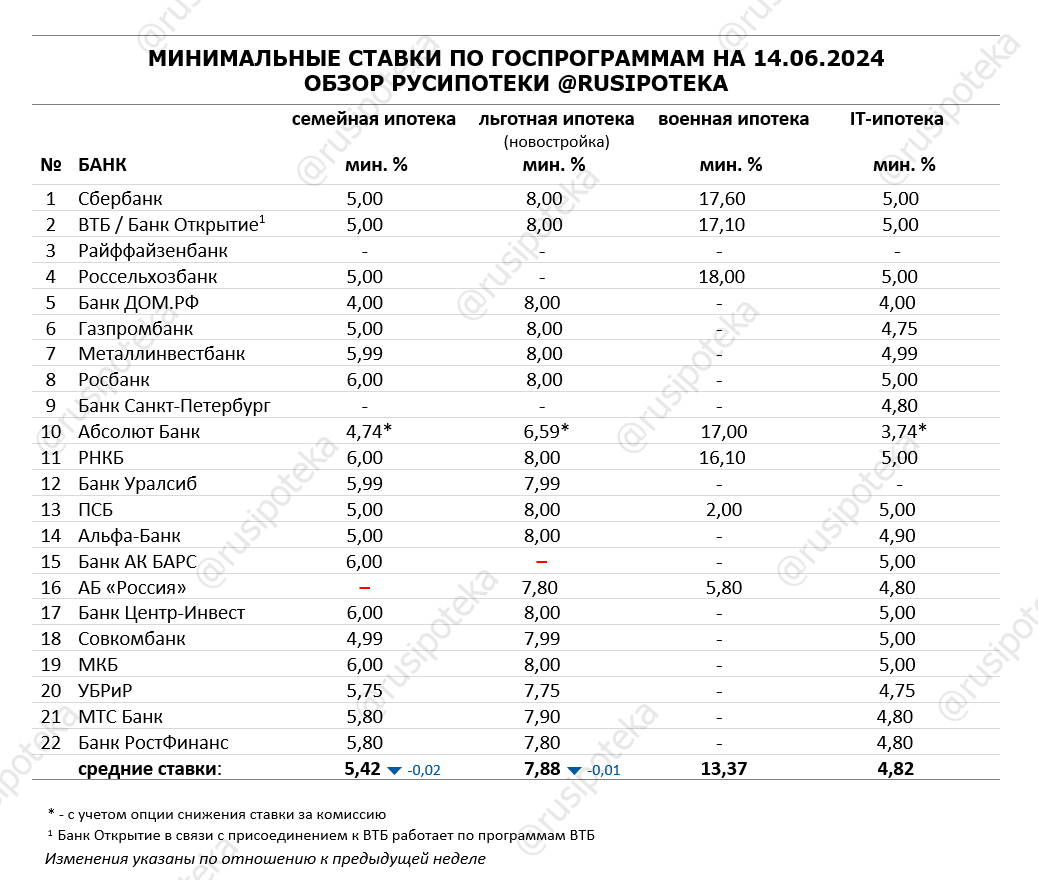 Обзор ипотечных ставок ведущих кредиторов по данным на 14 июня 2024 года