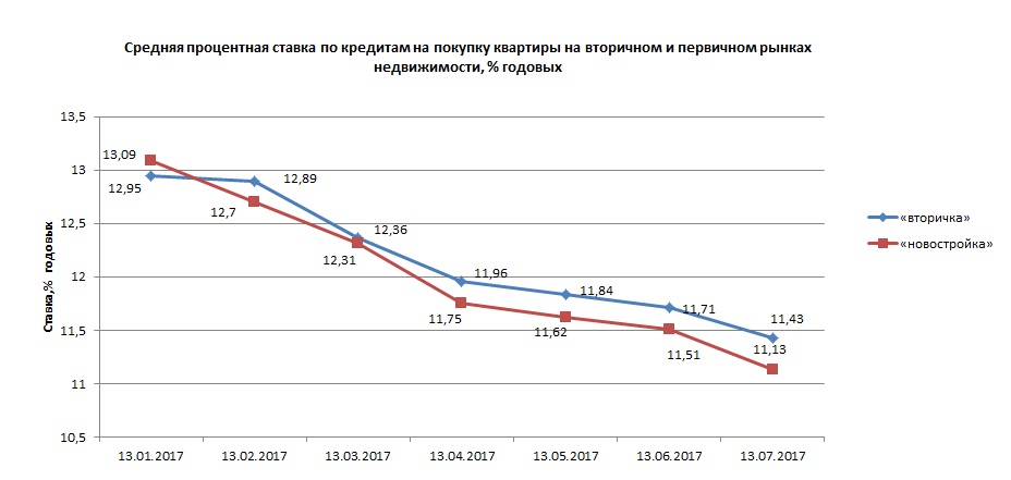 В частности, средняя ставка по программам, предназначенным для покупки квартир на вторичном рынке недвижимости, снизилась на 0,28 п. п. до 11,43% годовых, а по кредитам на приобретение строящихся квартир — на 0,38 п. п. до 11,13% годовых.