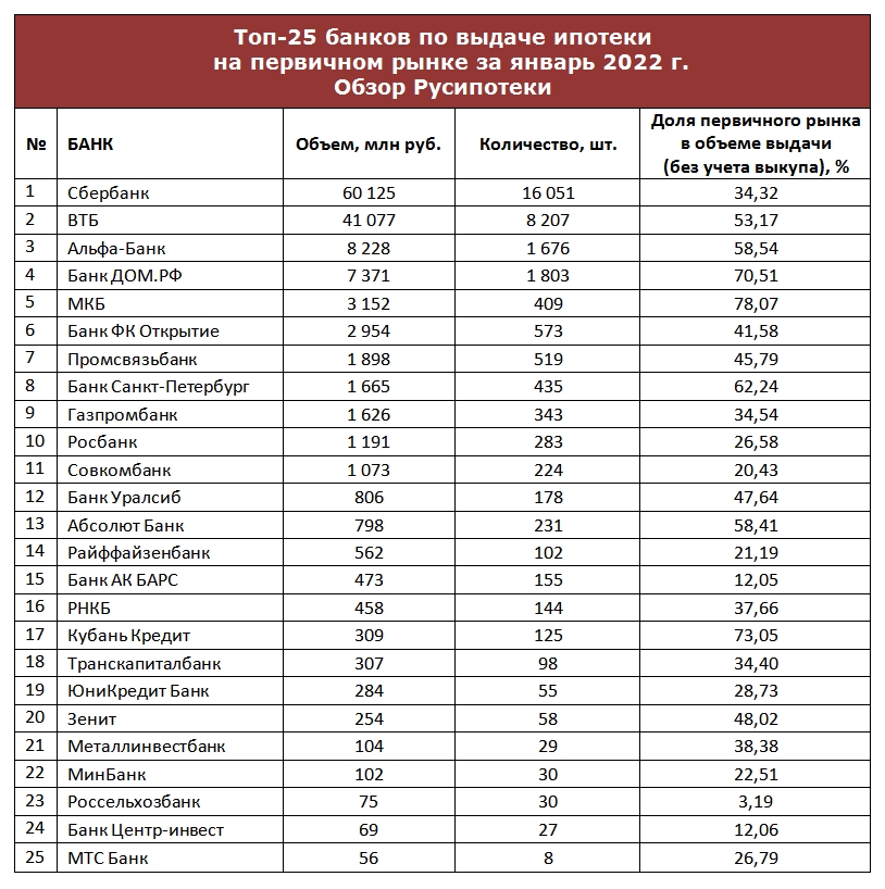 Топ-25 банков по выдаче ипотечных кредитов на первичном рынке за январь 2022 года
