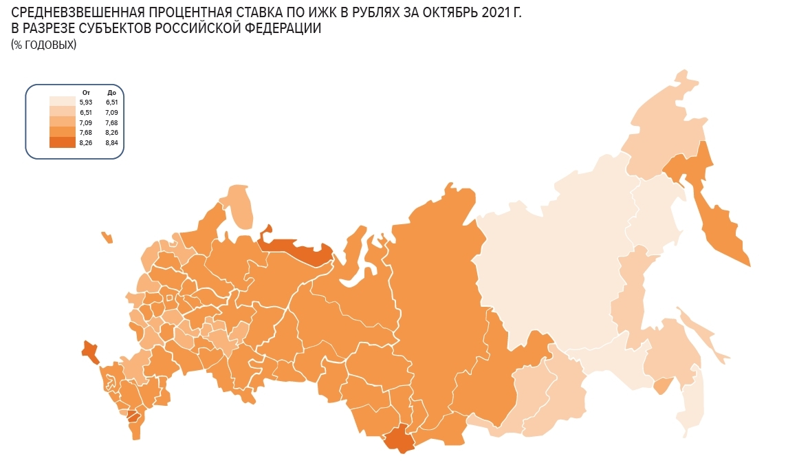 При этом самая дорогая ипотека была зафиксирована в Республике Ингушетия (8,84%), г.Севастополь (8,73%) и Республике Крым (8,71%). Отметим, что средняя ставка по ипотеке в целом по России в октябре 2021 года снизилась на 0,03 п.п., до 7,70% с 7,73% в сентябре.